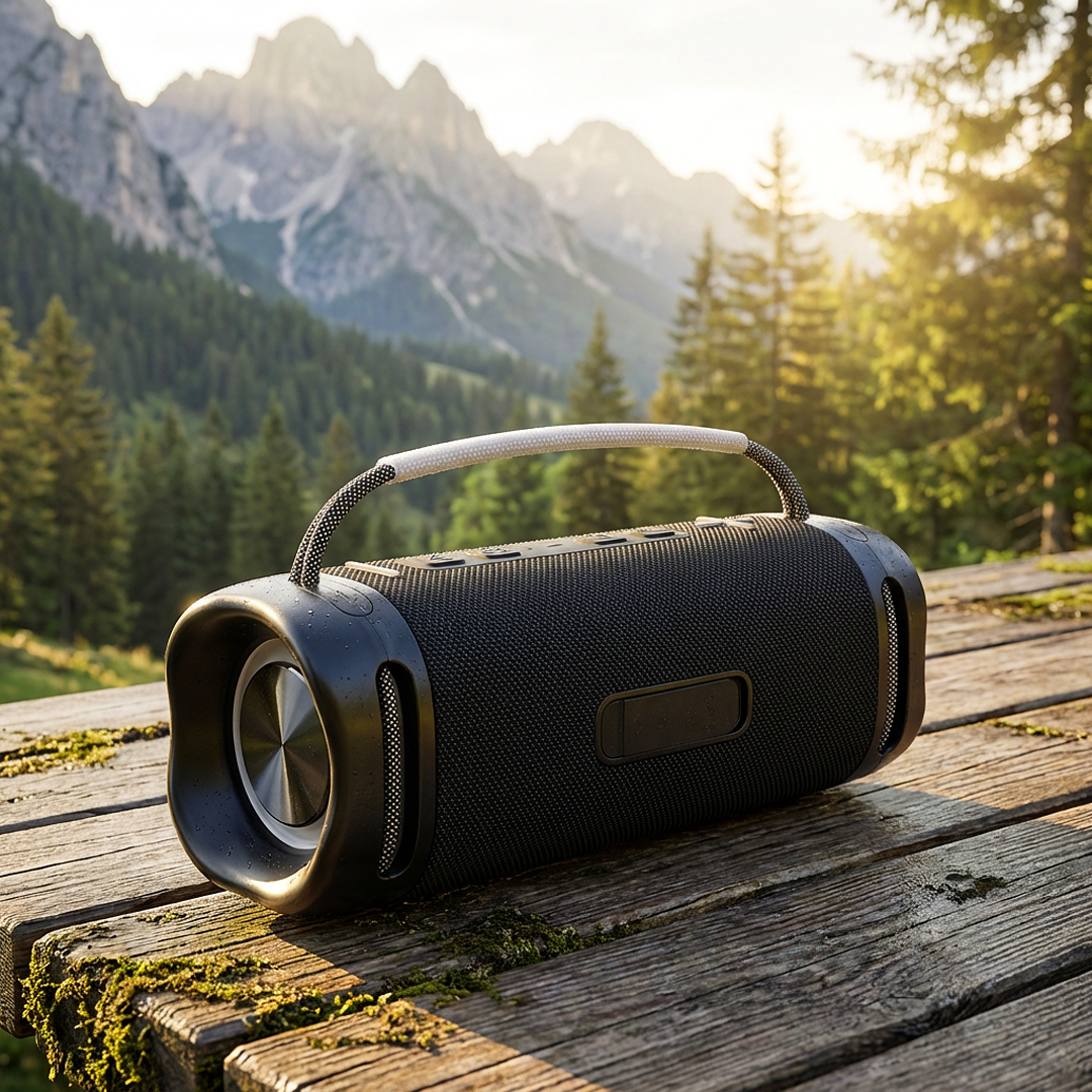 Waterproof wireless speaker with IPX7 protection, designed for use in demanding conditions, outdoors or on the go. It delivers powerful 30 W sound output and a stable BT connection, while the high-capacity battery ensures long playback time. The robust construction and carrying handle make it suitable as a practical promotional product as well. Supplied in a gift box with a Type-C charging cable included. Key features: Wireless speaker • Speaker power 30 W • BT version 5.4 • Operating range up to 10 m • Rechargeable battery capacity 6000 mAh • Playing time up to 25 hours (70% volume) • IPX7 waterproof • Type-C charging cable included • Carrying handle • Gift box.