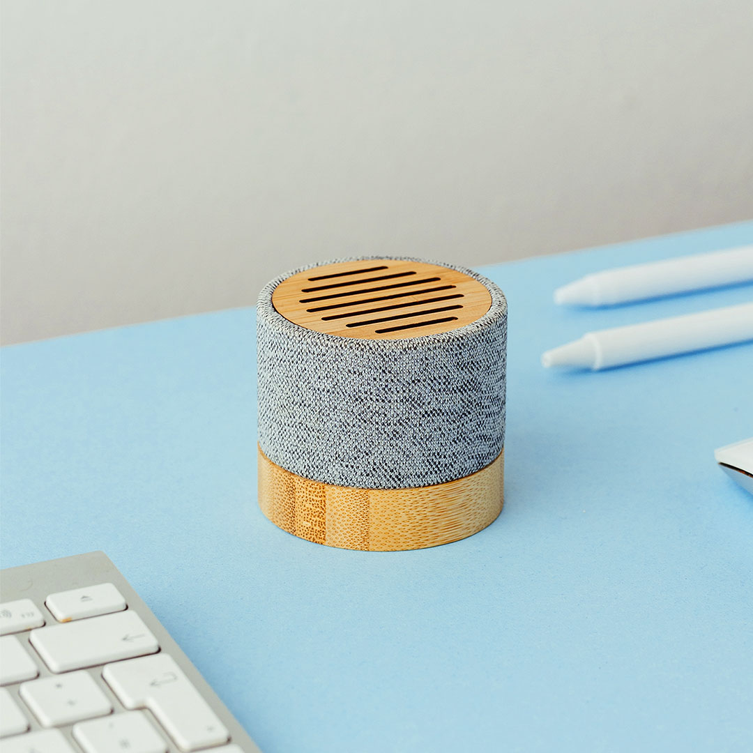 Wireless speaker with 3 W output power, featuring a bamboo and RPET housing, designed for everyday use at home or in the office. Its compact format makes it a practical choice for promotional and corporate gifting. Supplied in a gift box with a Type-C charging cable included. Key features: Wireless speaker • Speaker power 3 W • BT version 5.0 • Operating range up to 10 m • Rechargeable battery capacity 300 mAh • Charging time up to 2 hours • Playing time up to 2 hours • Material: bamboo and RPET • Type-C charging cable included • Gift box.