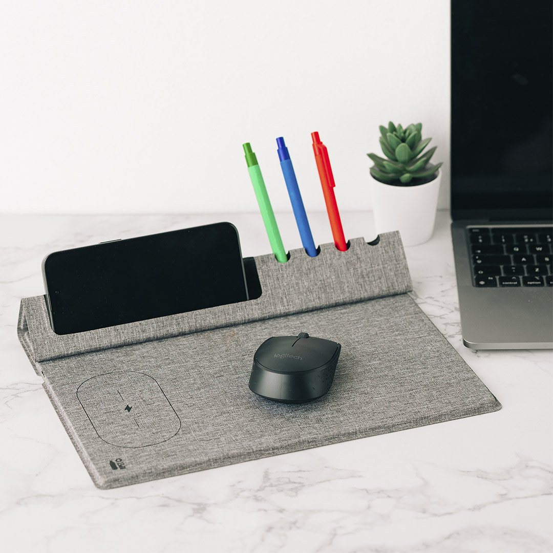 The mouse pad with an integrated 15W wireless charger is a practical and functional solution for a modern workspace. Made from RPET material, it supports an eco-friendly approach to promotional products. The foldable section also serves as a holder for a mobile phone and pens, helping keep the desk organized and efficient. Supplied in a box, this product is a useful corporate gift suitable for branding. Key features: Mouse pad • 15W wireless charger • Material: RPET • Foldable section with phone and pen holder • Workspace organization • Supplied in box • Suitable for branding.