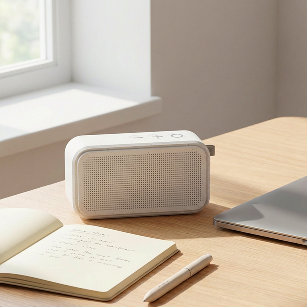 Wireless speaker with 3 W output power and a higher-capacity battery, designed as a practical promotional product for everyday use at the office, at home or on the go. The extended playback time makes it a suitable corporate gift ensuring longer usage and brand visibility. Supplied in a gift box with a Type-C charging cable included. Key features: Wireless speaker • Speaker power 3 W • BT version 5.3 • Operating range up to 10 m • Rechargeable battery capacity 500 mAh • Charging time up to 2 hours • Playing time up to 6 hours • Type-C charging cable included • Gift box.