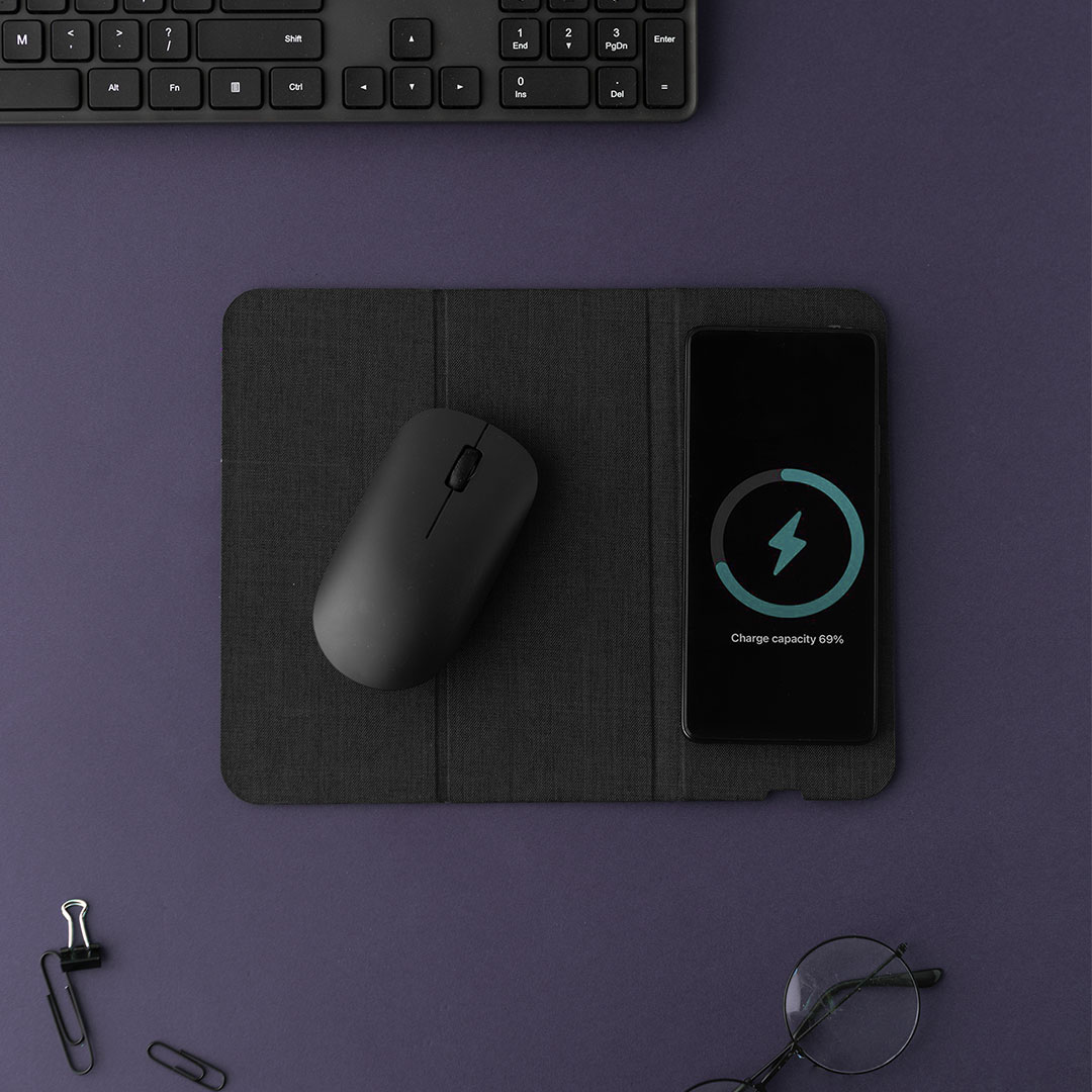 The mouse pad with integrated 15W wireless charger is a practical and modern solution for everyday office or home use. Made from RPET material, it supports a sustainable and eco-friendly approach. Its foldable and portable design allows easy transport and a tidy workspace, while wireless charging enables convenient power supply for compatible devices without the need for cables. Supplied in a box, this product is a functional promotional item and corporate gift suitable for branding. Key features: Mouse pad • 15W wireless charger • Material: RPET • Foldable design • Portable • Supplied in box • Suitable for branding.